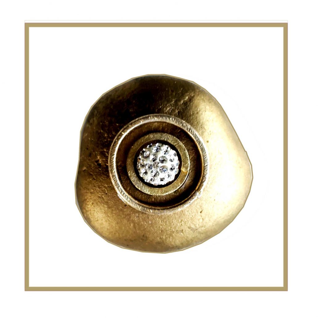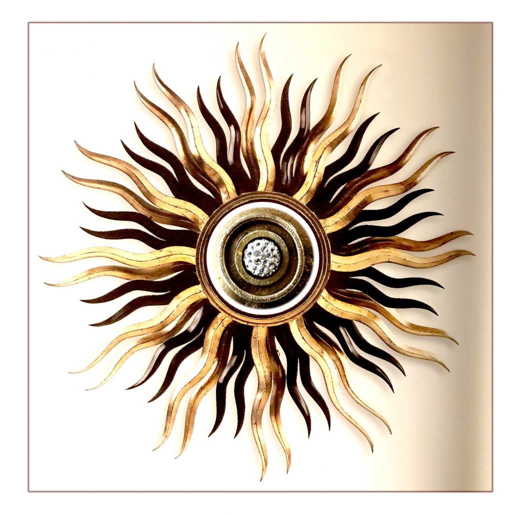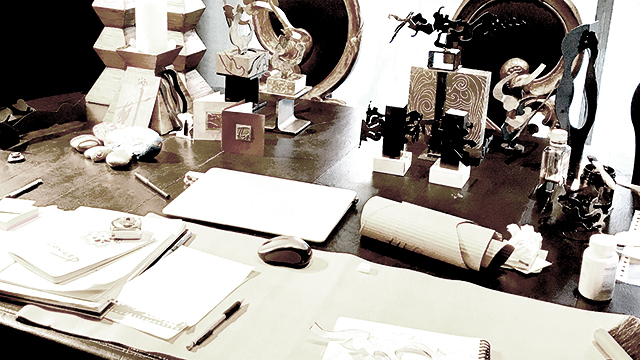 She works with oxidized patinas, gold, gold leaf, and varnish, giving her work confidence and warmth.
